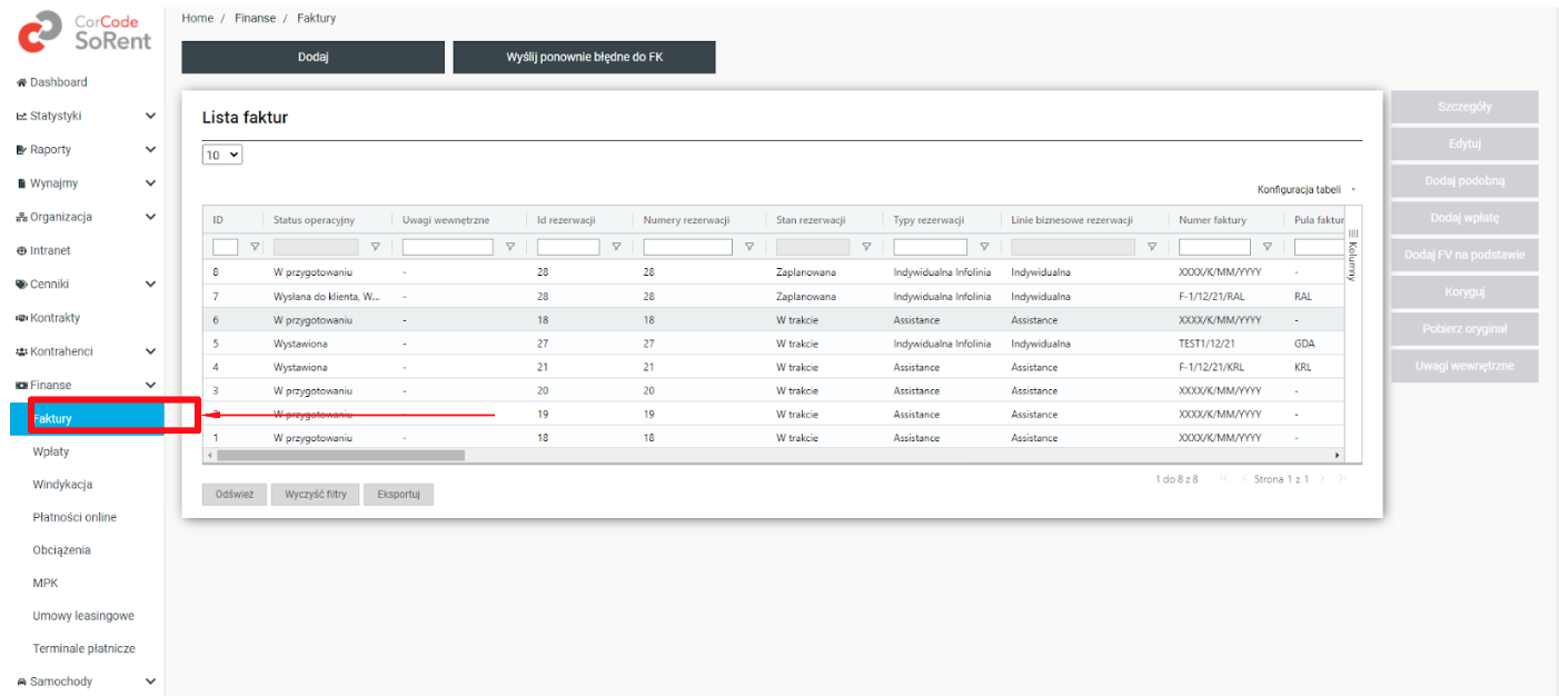 W zakładce Finanse → Faktury znajduje się lista wszystkich dokumentów finansowych, które mogą być stworzone w systemie SoRent: