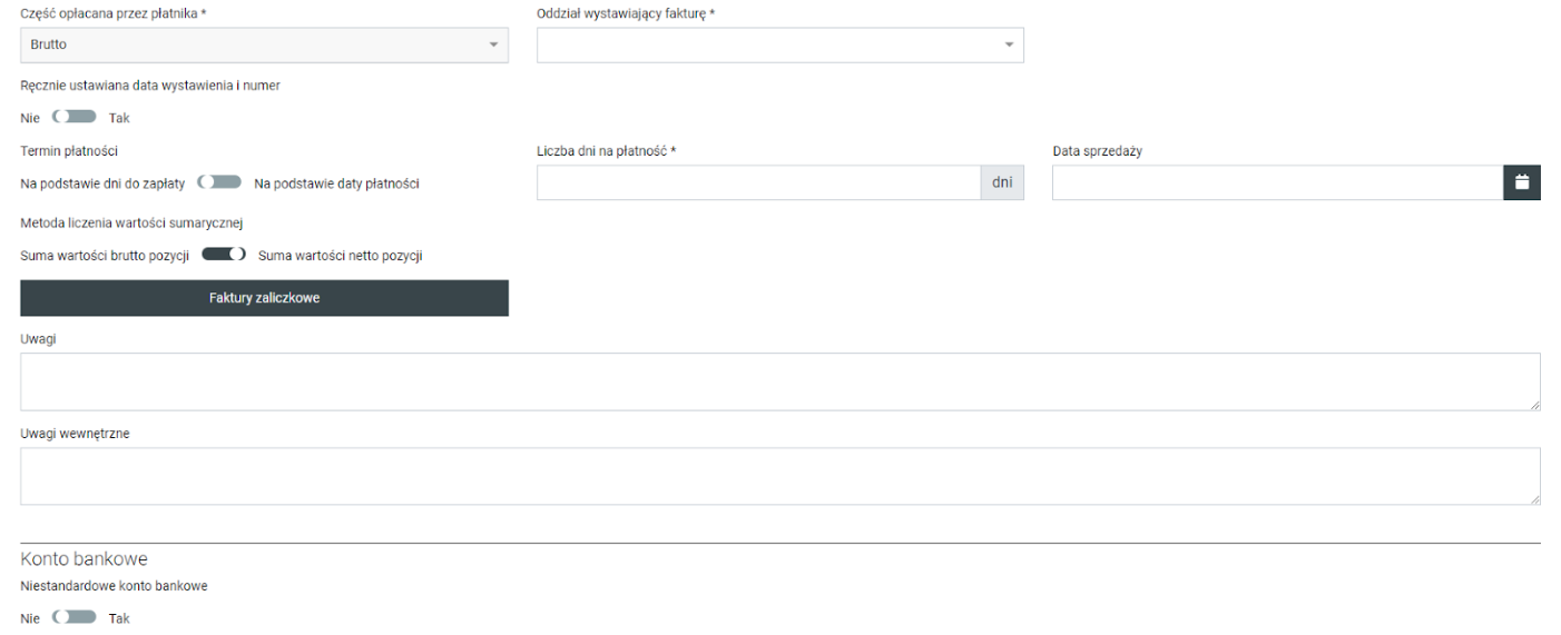 - Niestandardowe konto bankowe – gdy faktura ma być uregulowana płatnością na inne konto bankowe niż podane w ogólnej konfiguracji systemu to można je tutaj podać