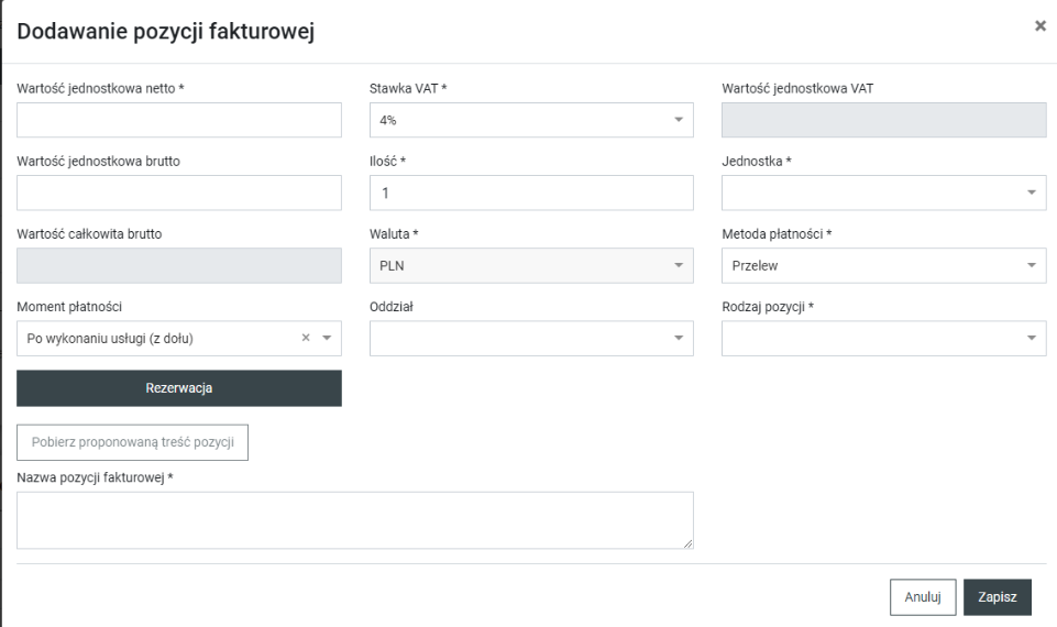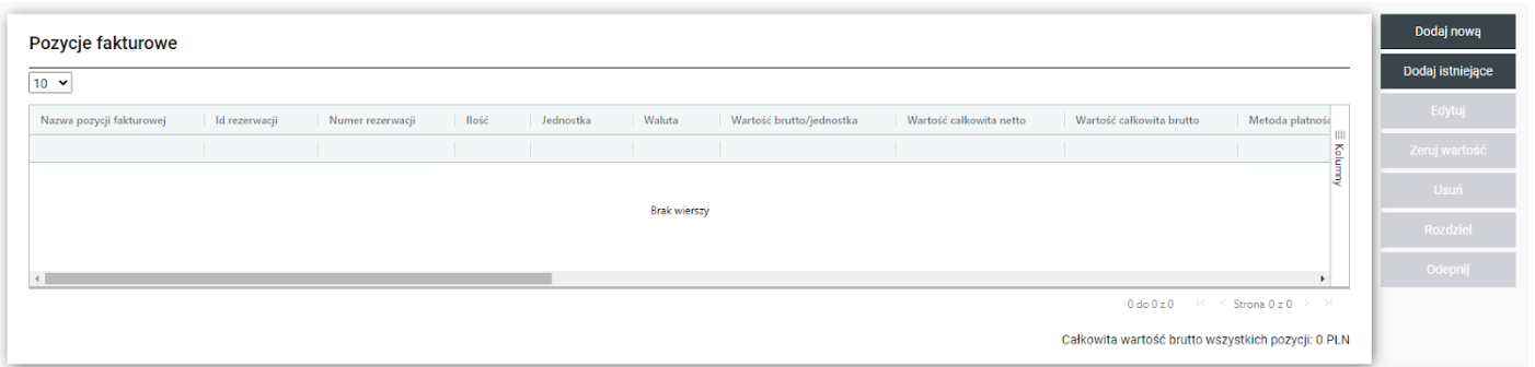Ostatnim etapem jest dodanie pozycji fakturowych. Należy to zrobić uzupełniając formularz, który pojawia się po kliknięciu przycisku “Dodaj nową”.