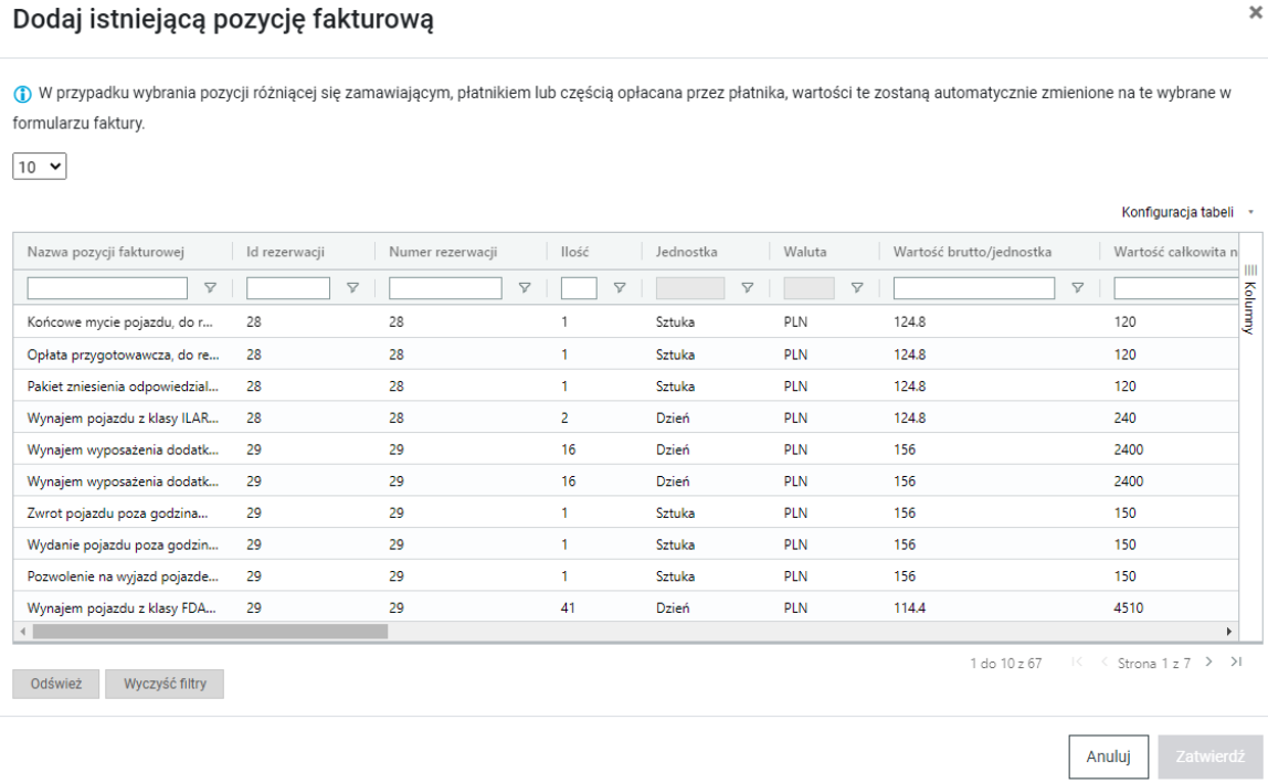 Można też wybrać istniejącą już w systemie pozycję fakturową. Po kliknięciu przycisku “Dodaj istniejącą” pojawi się lista pozycji fakturowych, które nie są przypisane do żadnej faktury, i w których płatnikiem jest płatnik wybrany powyżej.