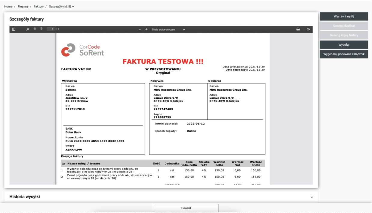 - Szczegóły - po wejściu w ten widok dostępny jest podgląd faktury. Z tego poziomu można również fakturę manualnie wystawić oraz wysłać do klienta i do FK.