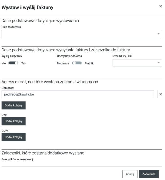 Po wejściu w szczegóły faktury w przygotowaniu należy kliknąć przycisk ”Wystaw i wyślij”. Po otwarciu okna podstawią się domyślne parametry, które można zmienić. Po ich zatwierdzeniu faktura zostanie wystawiona (zostanie nadany numer) oraz zostanie wysłana do FK i do klienta na adres e-mail.
